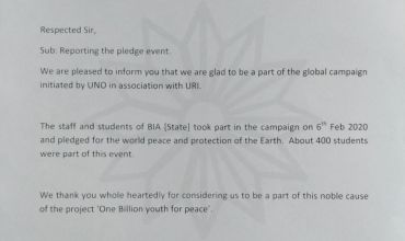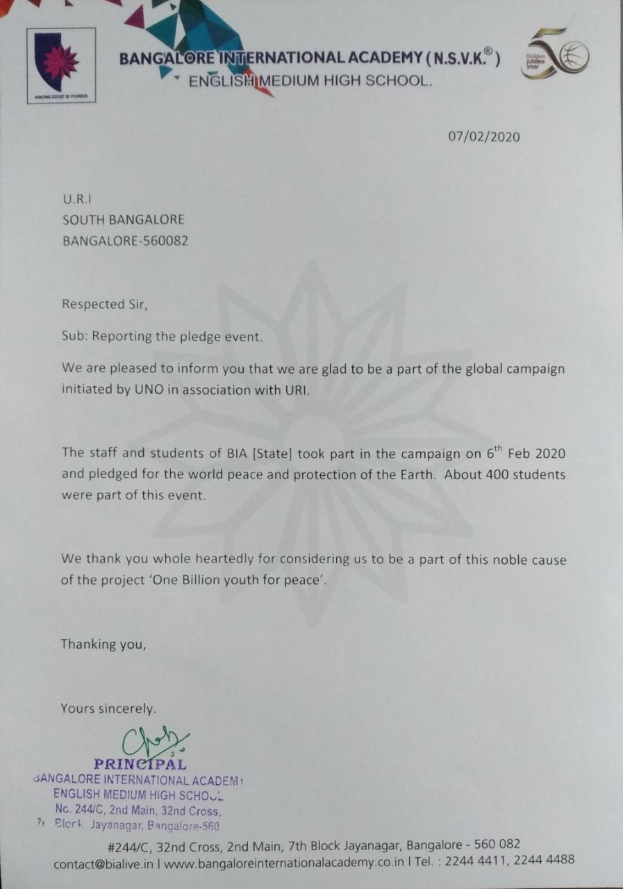 Peace Pledge at Bangalore International Academy English Medium School, Bangalore, on 6th February 2020. 400 students and staff took part of this event