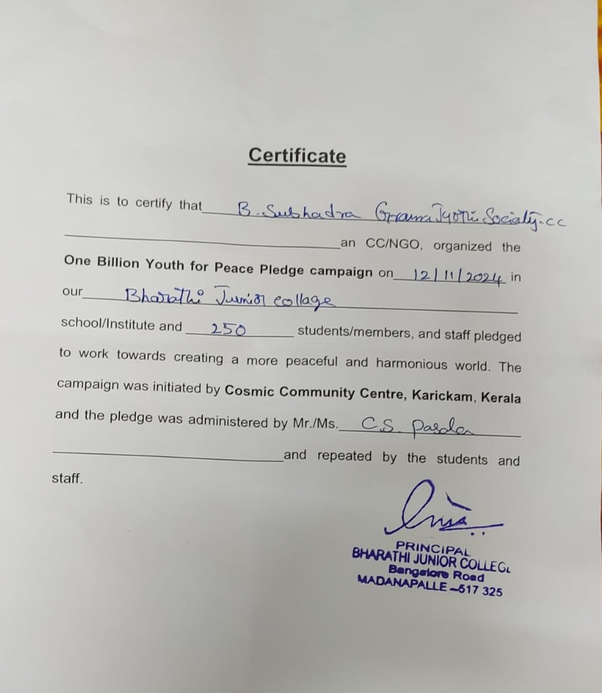 "One Billion Youth for Peace" the Global Campaign Peace Pledge taken by the students and staff of Junior College, Madanapalle, Andhrapradesh on 12/11/2024. 250 students and staff took the pledge.