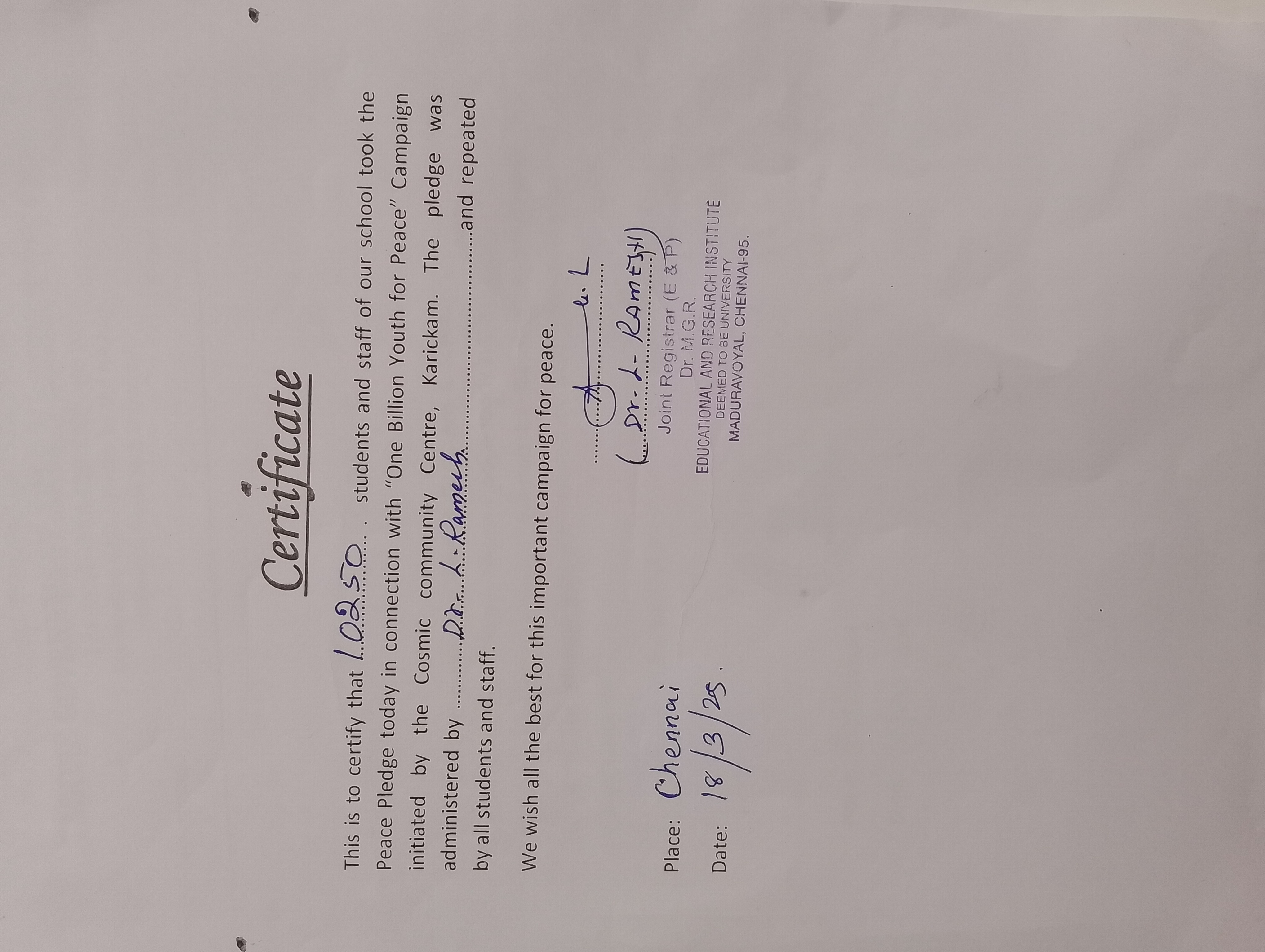 Peace Pledge at Dr. MGR University, Chennai on 18/03/2025. 10250 students and staff took the peace pledge. The pledge was administered by Dr. L Ramesh and repeated by all students and staff.