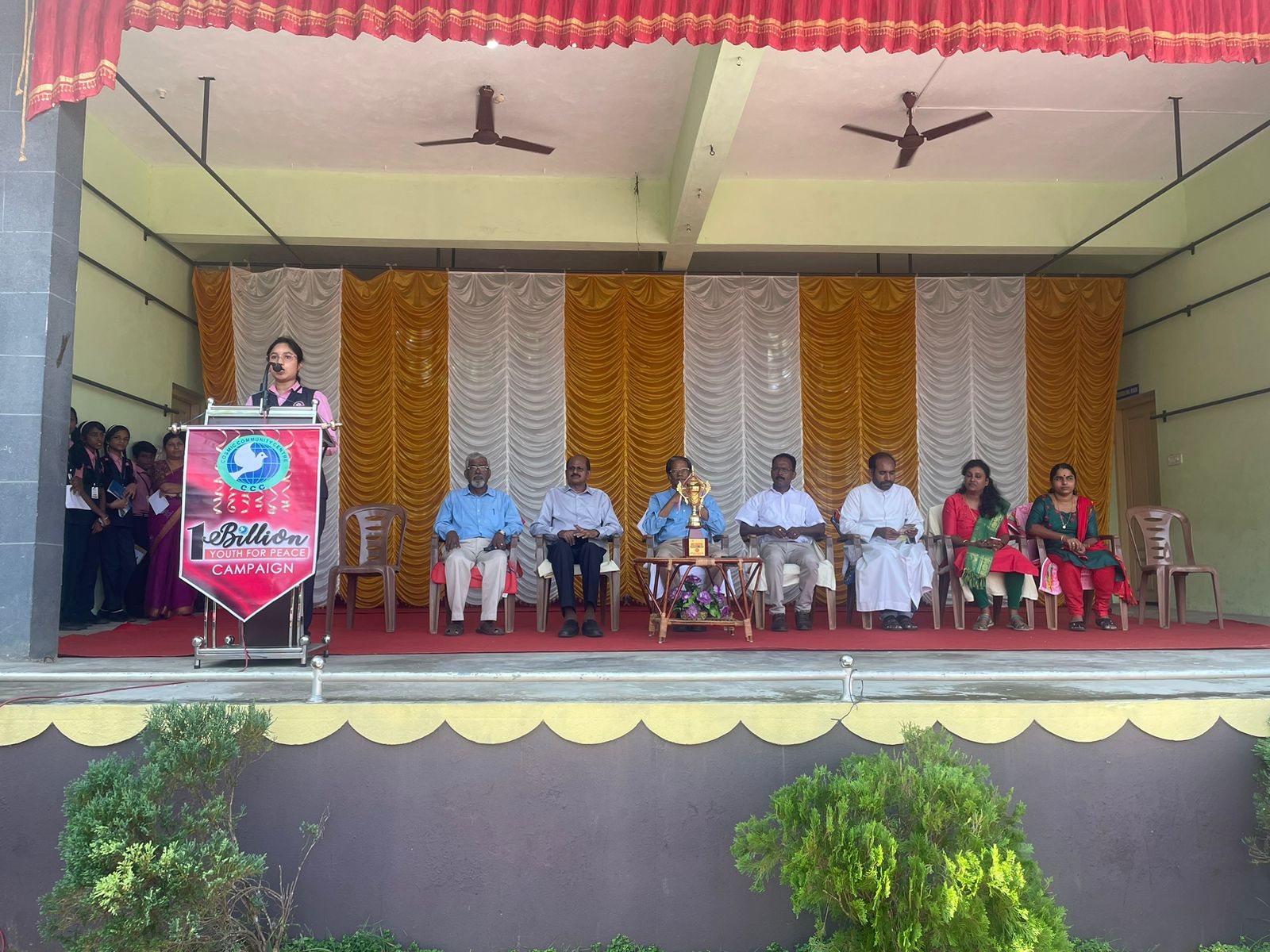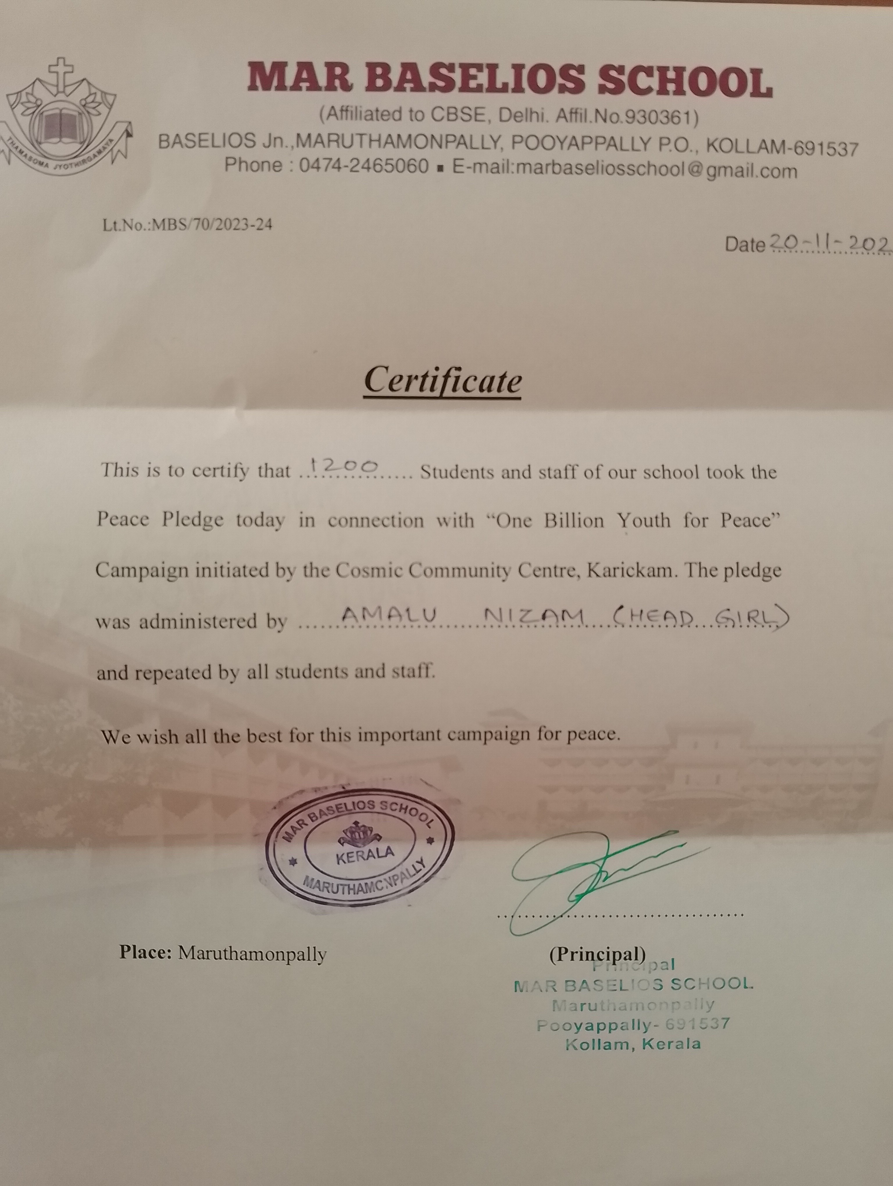One Billion Youth for Peace Pledge at Mar Baselios School, Maruthamanpally on 20th November 2023. 1200 students and staff took the peace pledge. The pledge was administered by Head Girl Amalu Nizam and repeated by all students and staff.