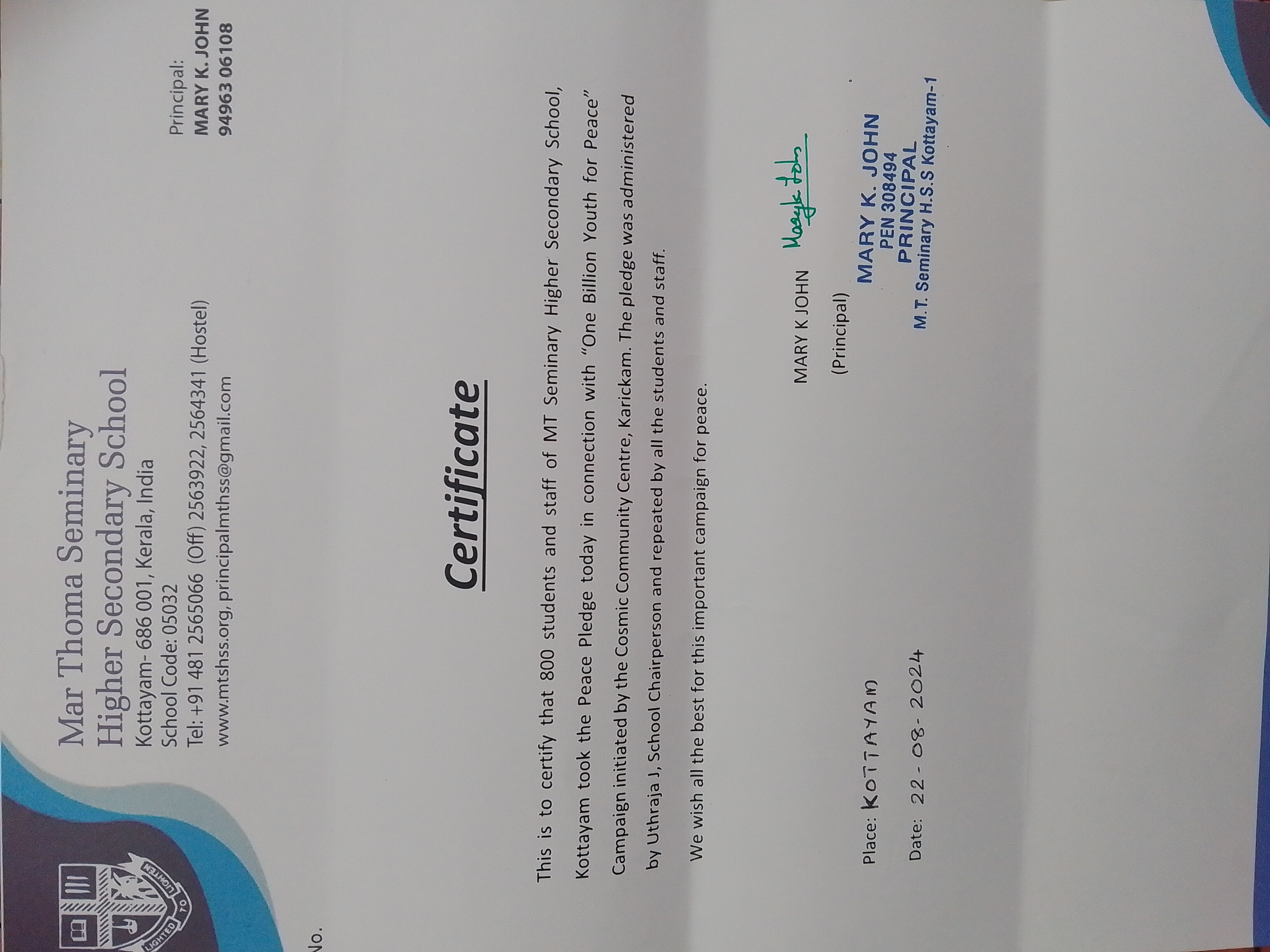Peace Pledge at Mar Thoma Seminary Higher Secondary School, Kottayam on 22nd August 2024. 800 students and staff took the Peace Pledge. The pledge was administered by Uthraja J, school chairperson and repeated by all the students and staff.