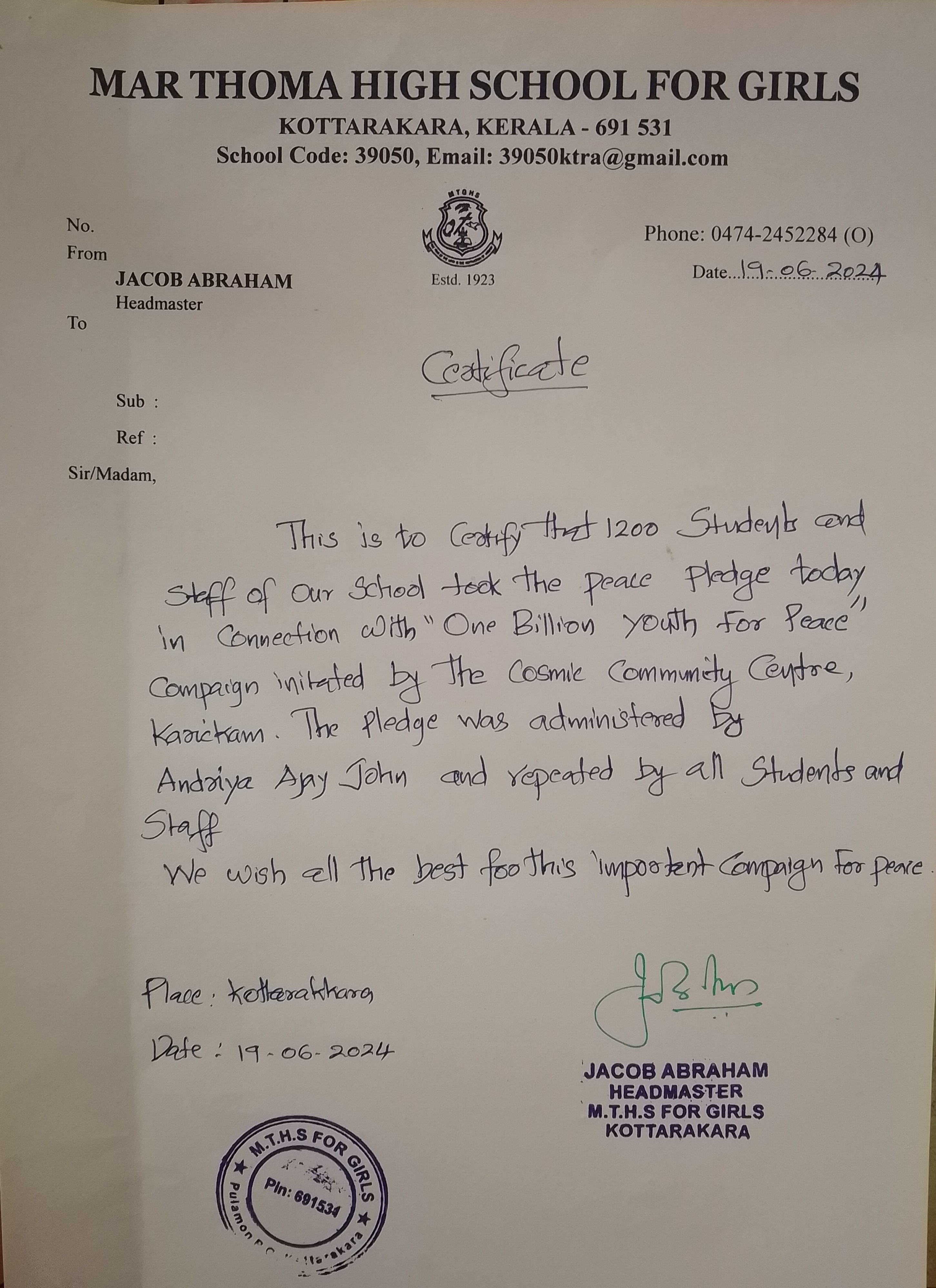 Peace Pledge at Marthoma Girls Gigh School, Kottarakkara on 19/06/2024. 1200 students and staff participated in the pledge. The Pledge was administrated by Andriya Ajay John.