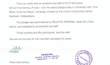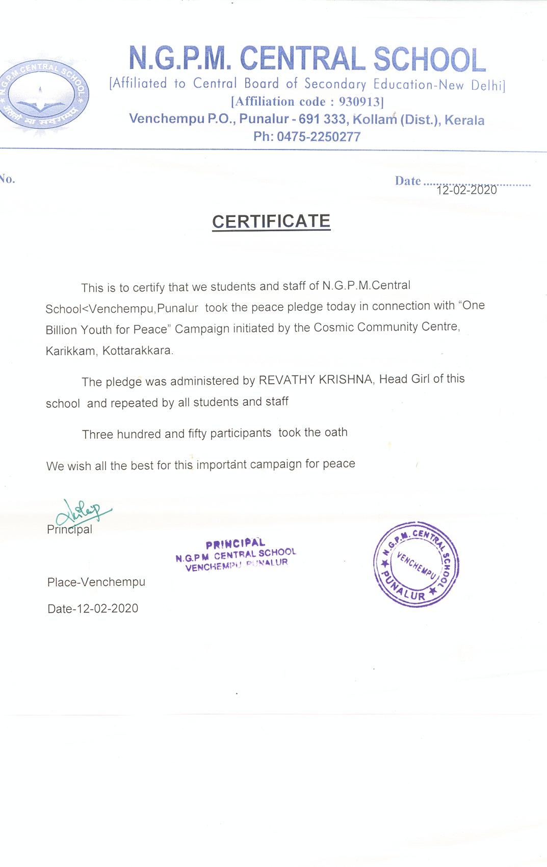 Peace Pledge at N.G.P.M Central School Venchempu, Punalur on 12th February 2020 as part of the "One Billion Youth for Peace Campaign". The pledge was administered by Revathy Krishna Head Girl of this school and repeated by all students and staff. 350 stdents and staff took the oath.
