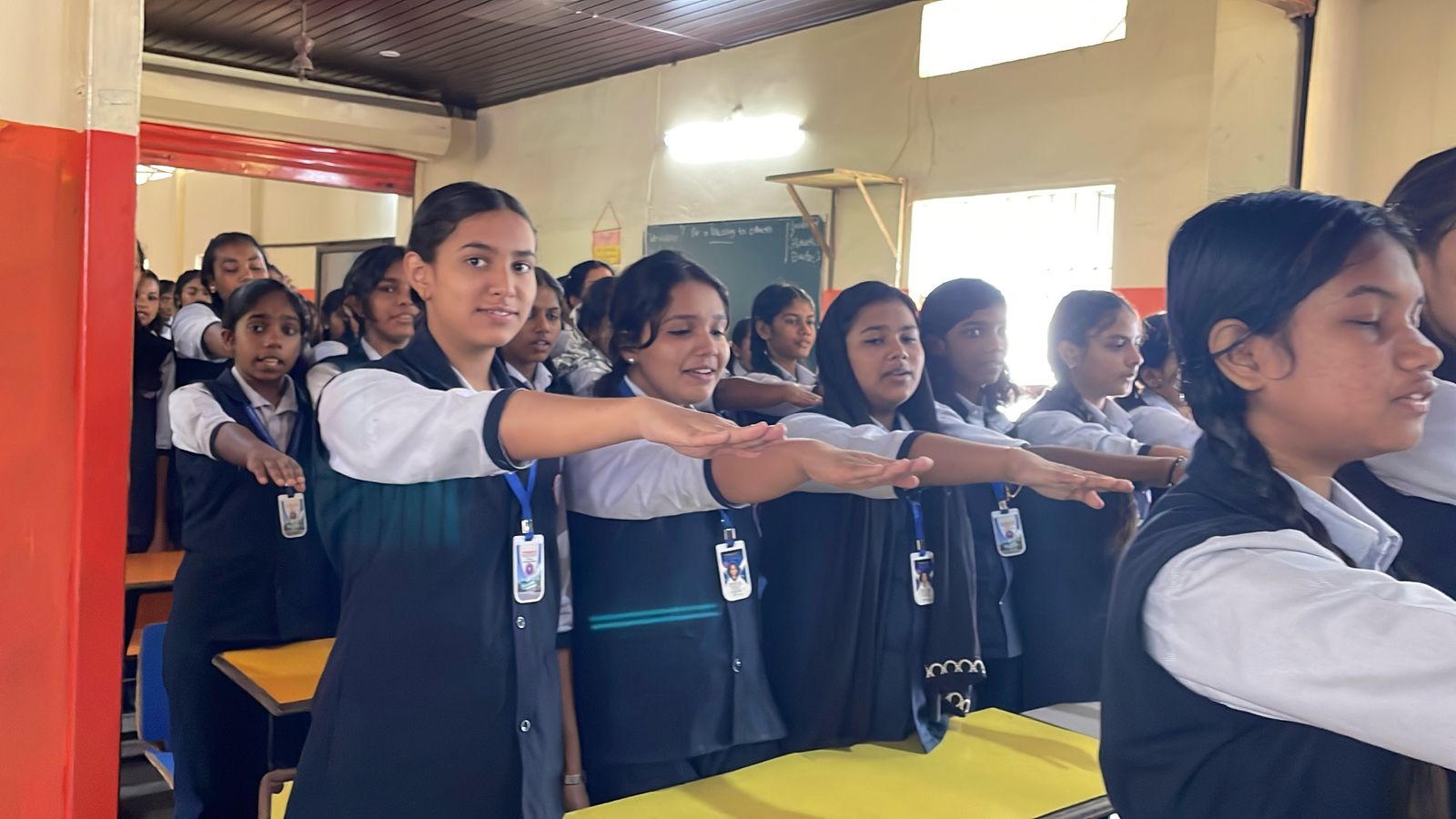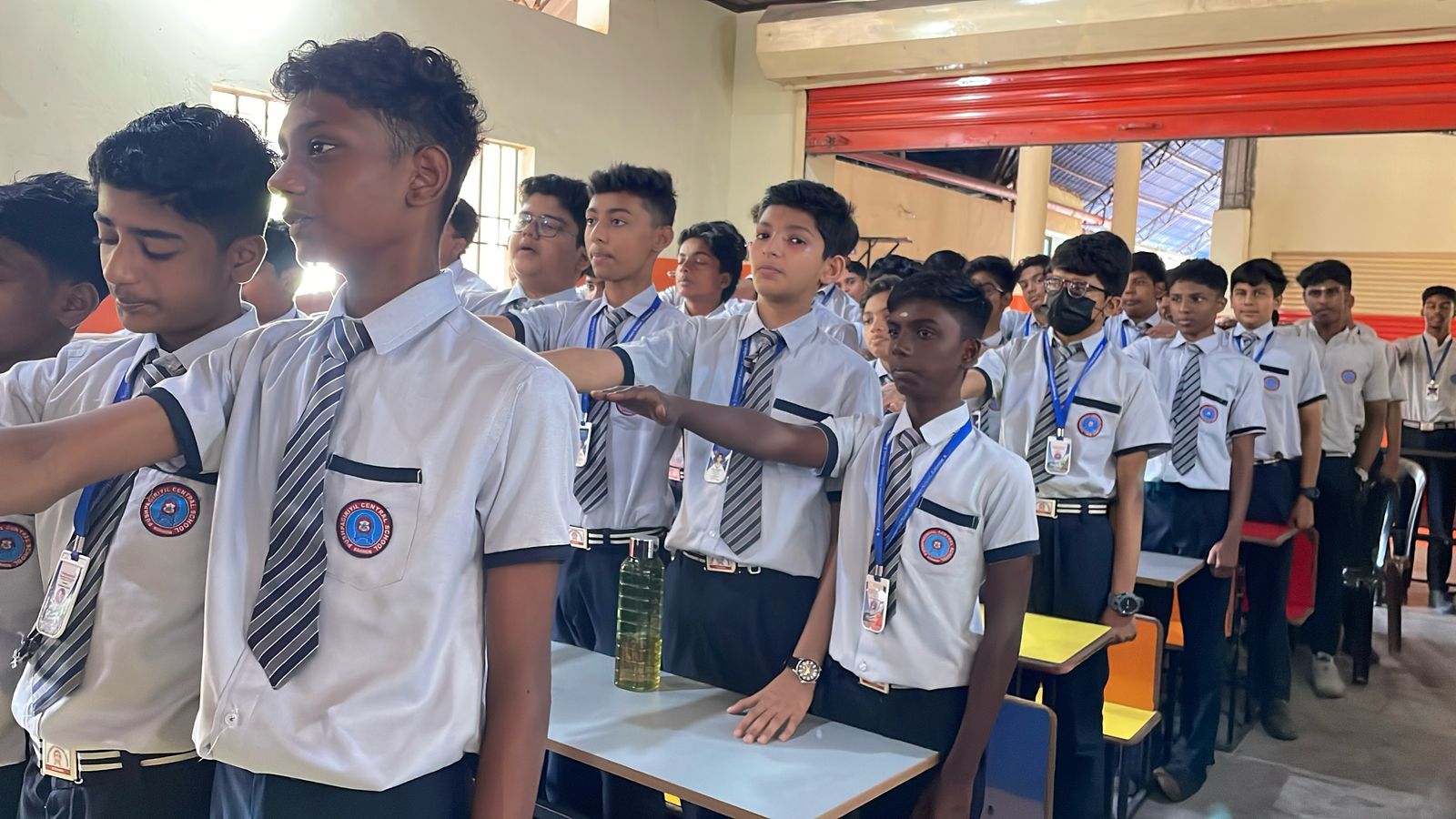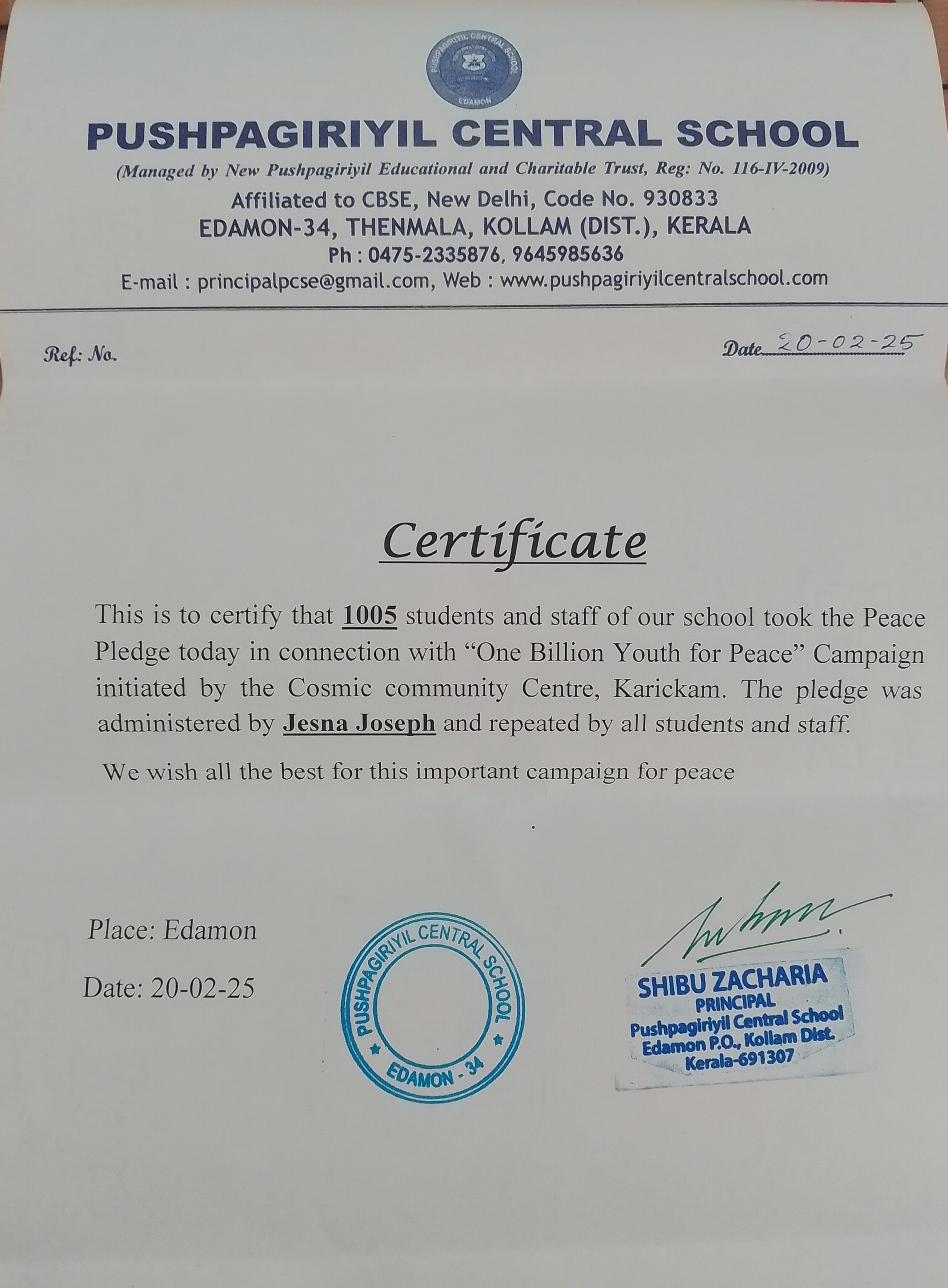 Peace Pledge at Pushpagiriyil Central School, Edamon on 20/02/2025. 1005 students and staff took the Peace Pledge. The pledge was administered by Jesna Joseph and repeated by all students and staff.