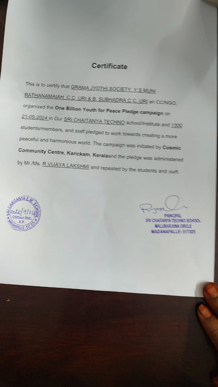 Peace Pledge at Sri Chaitanya Techno School, Madanapalle, Andhrapradesh on 21st September 2024. 1300 staff and students took the pledge.