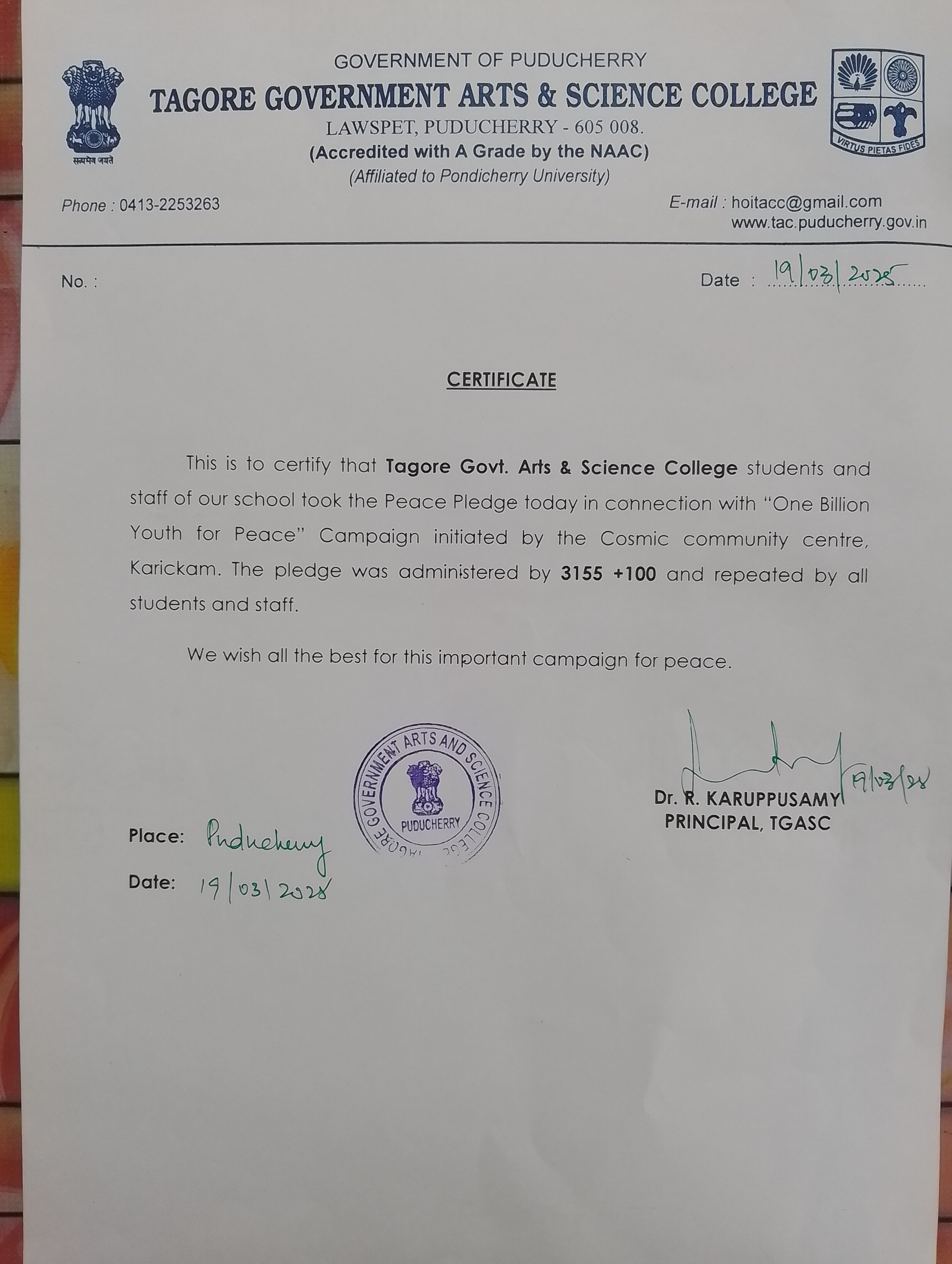Peace Pledge at Tagore Govt.Arts and Science College,Pondicherry on 19/03/2025. 3255 students and staff took the peace pledge.