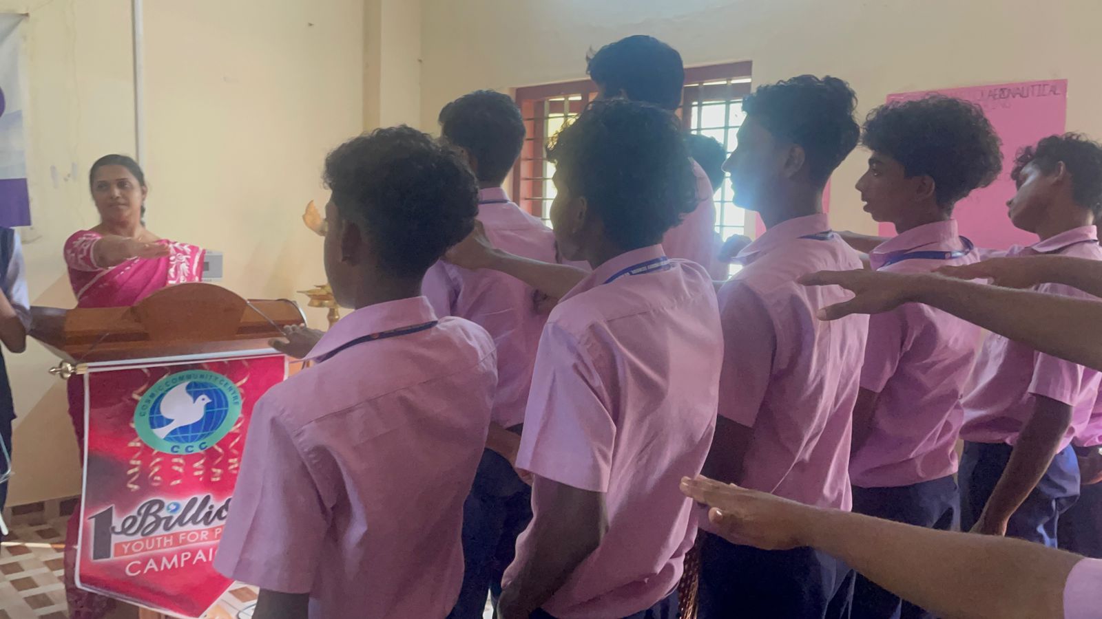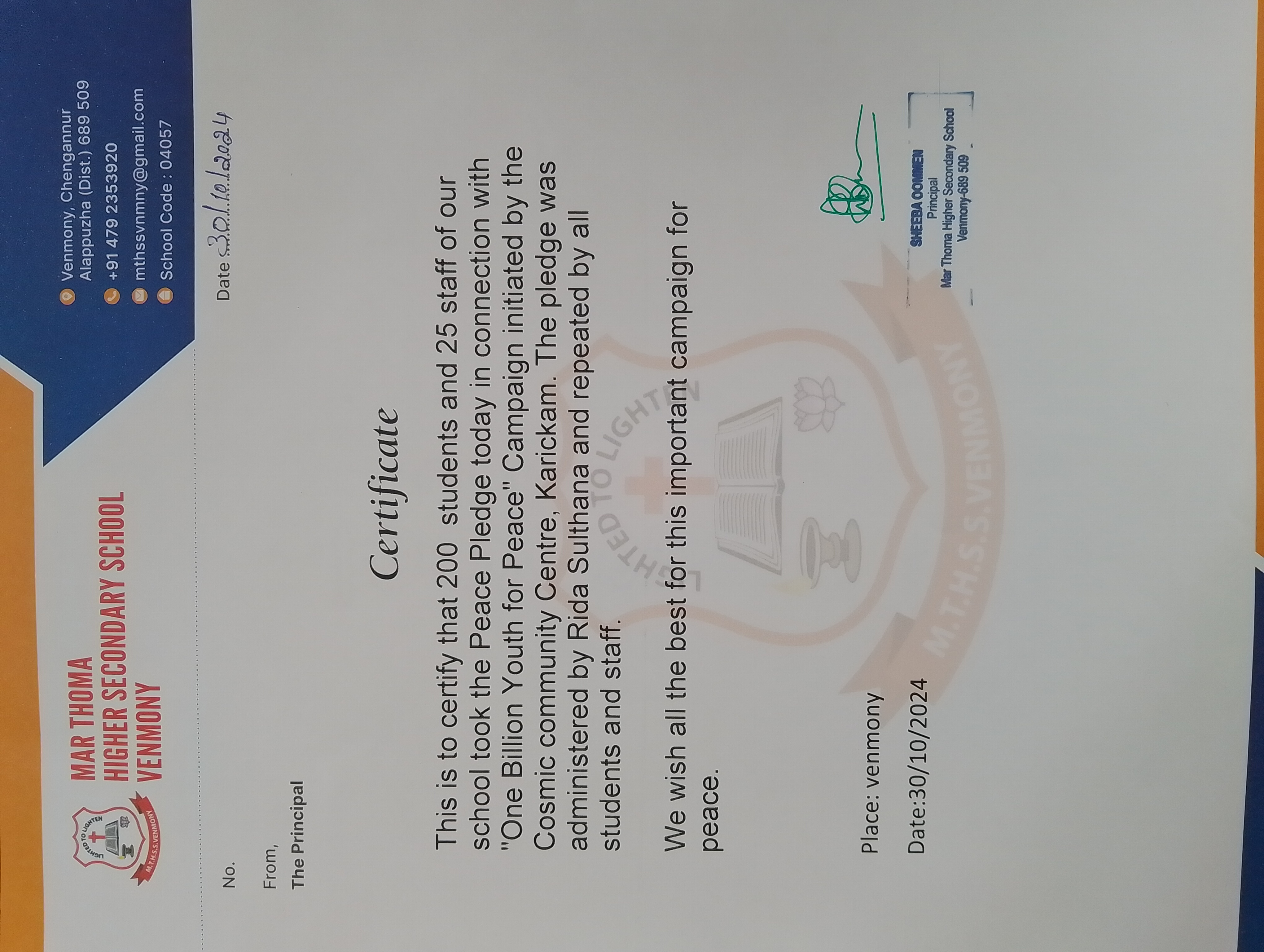 Peace Pledge at Mar Thoma Higher Secondary School, Venmony, Chenganur, Alapuzha on 30th October 2024. 225 staff and students took the peace pledge. The pledge was administered by Rita Sulthana and repeated by all students and staff.