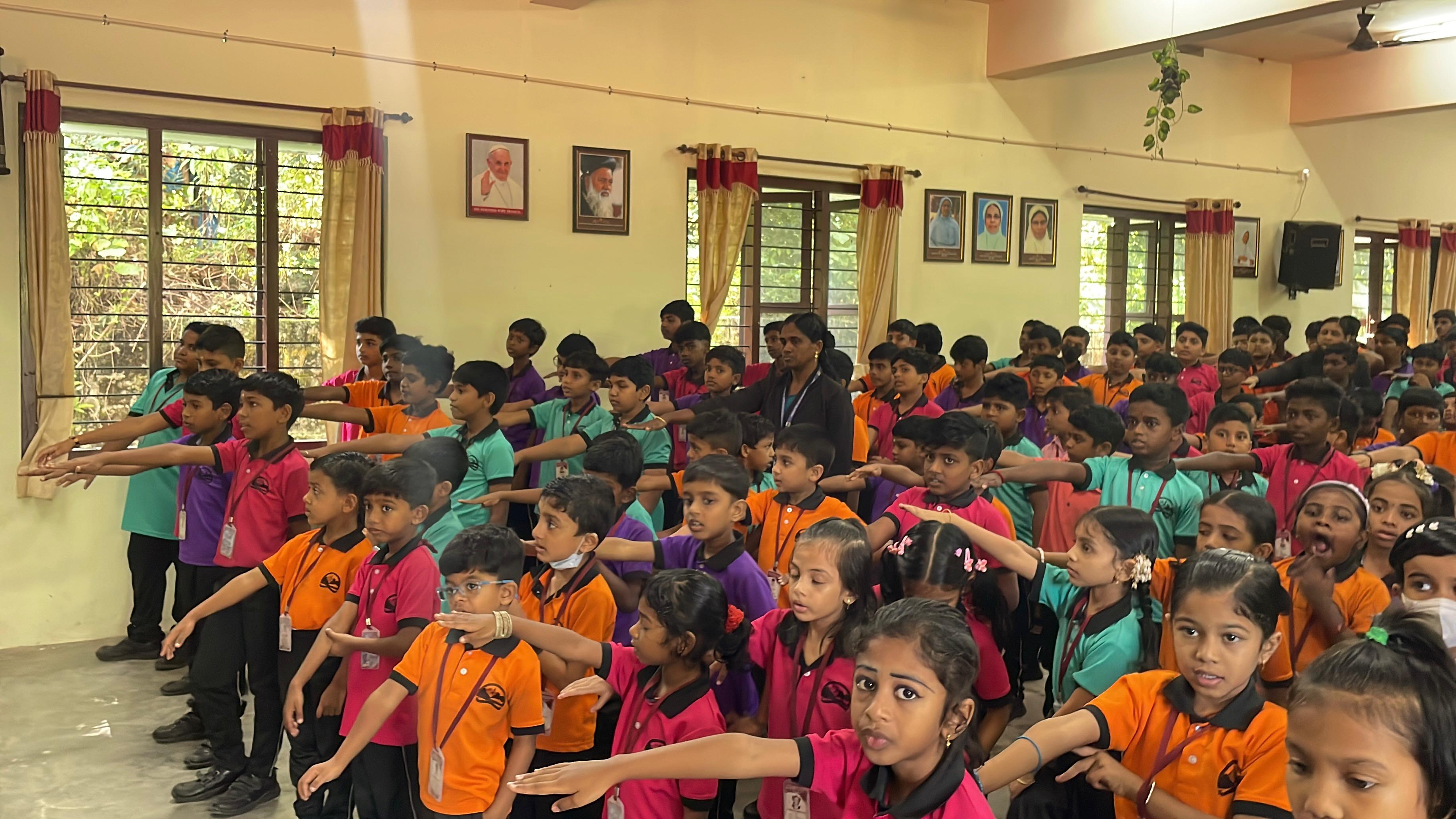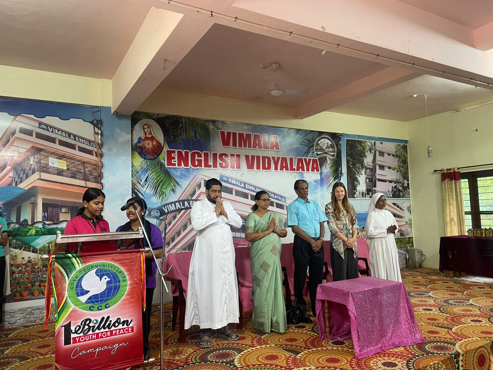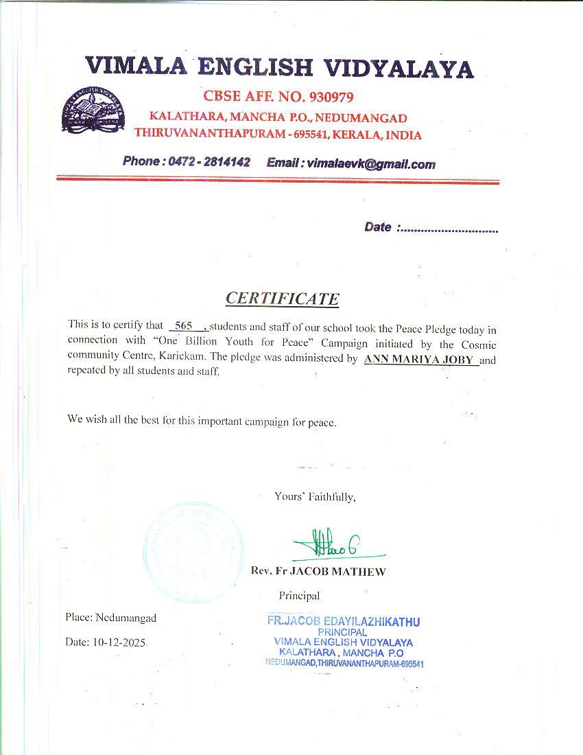Peace Pledge at Vimala English Vidyalaya, Kalathara, Nedumangadu on 10/11/2025. 565, students and staff of the school took the pledge. the pledge was administered by Ann Mary Joby and repeated by all students and staff.