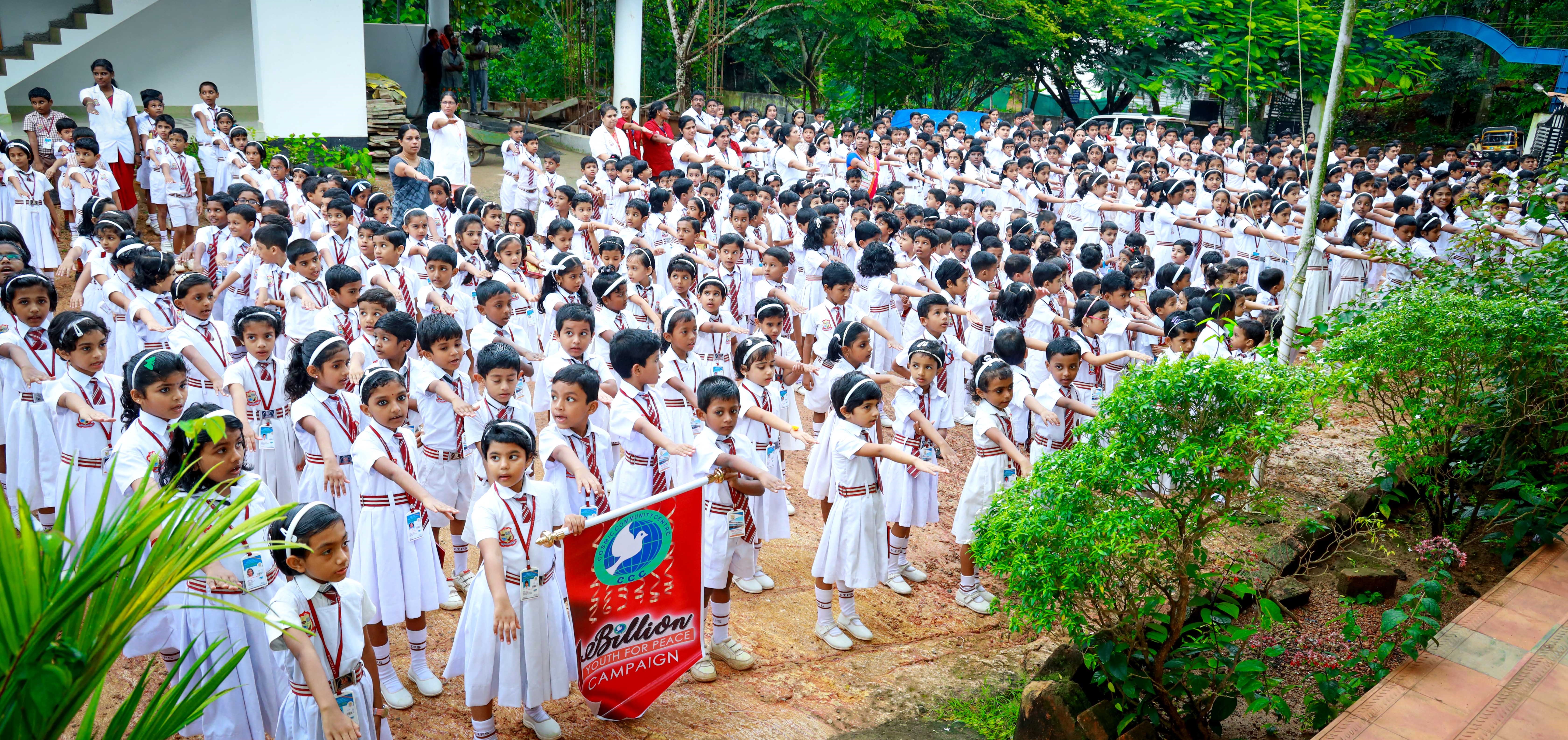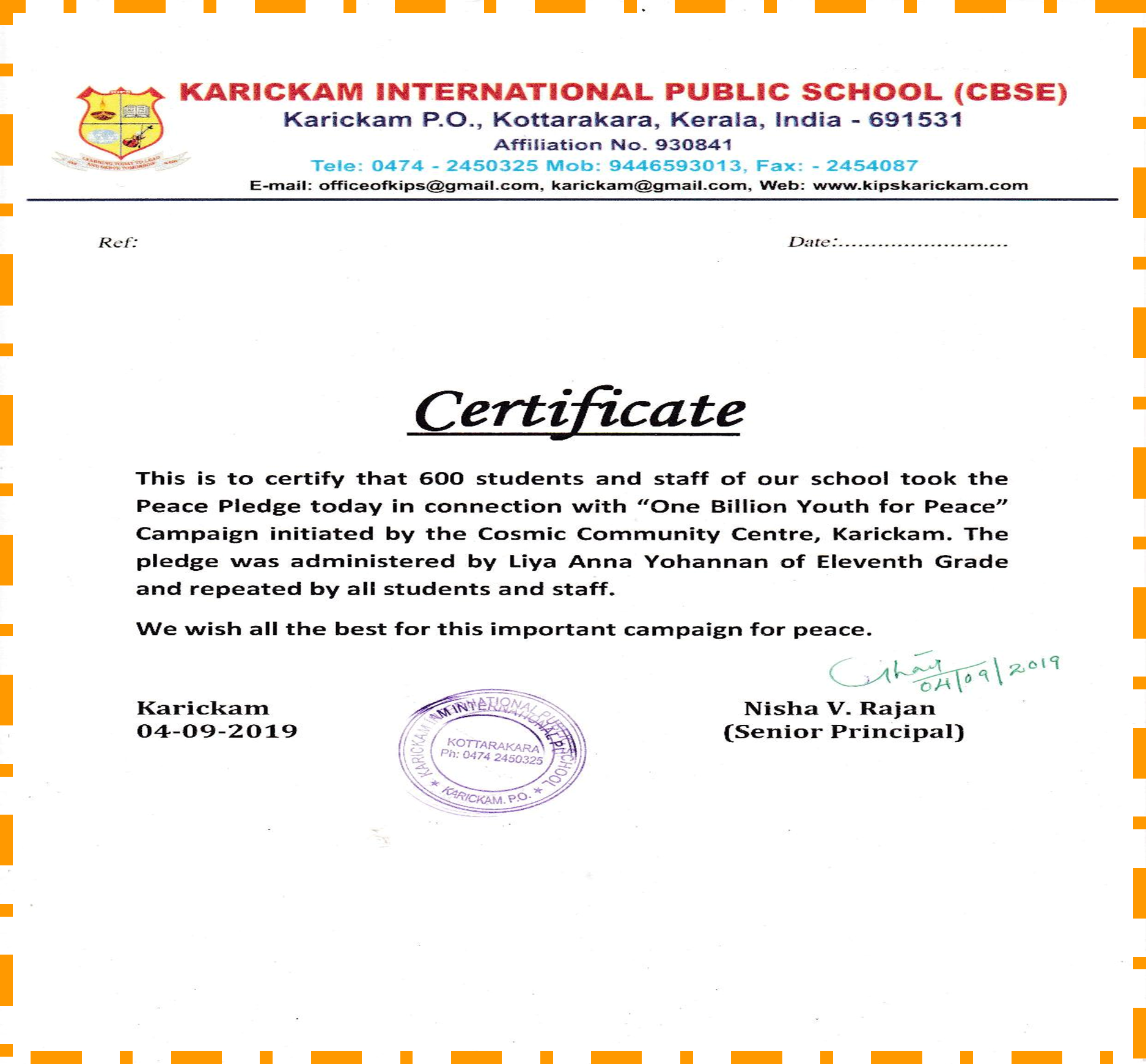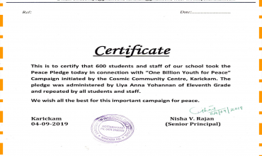 "One Billion Youth for Peace", the Global Campaign Peace Pledge taken by the students and staff of KIPS on 4th September 2019, at Karickam International Public School. 600 students and staff participated the pledge. Plus One student Liya Anna Yohannan led the pledge.